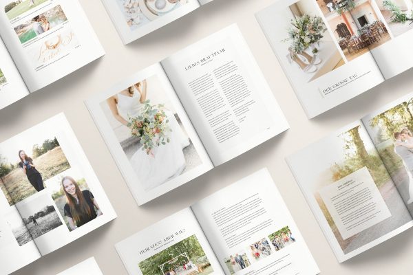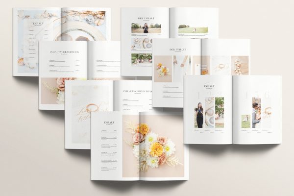Indesign Vorlage für deinen ganz individuellen Wedding Guide mit über 80 Seiten deutschsprachigen Inhalt. Dieses Magazin für Brautpaare enthält alle wichtigen Informationen, viele Tipps und Inspirationen rund um die Hochzeitsplanung und den Hochzeitstag.